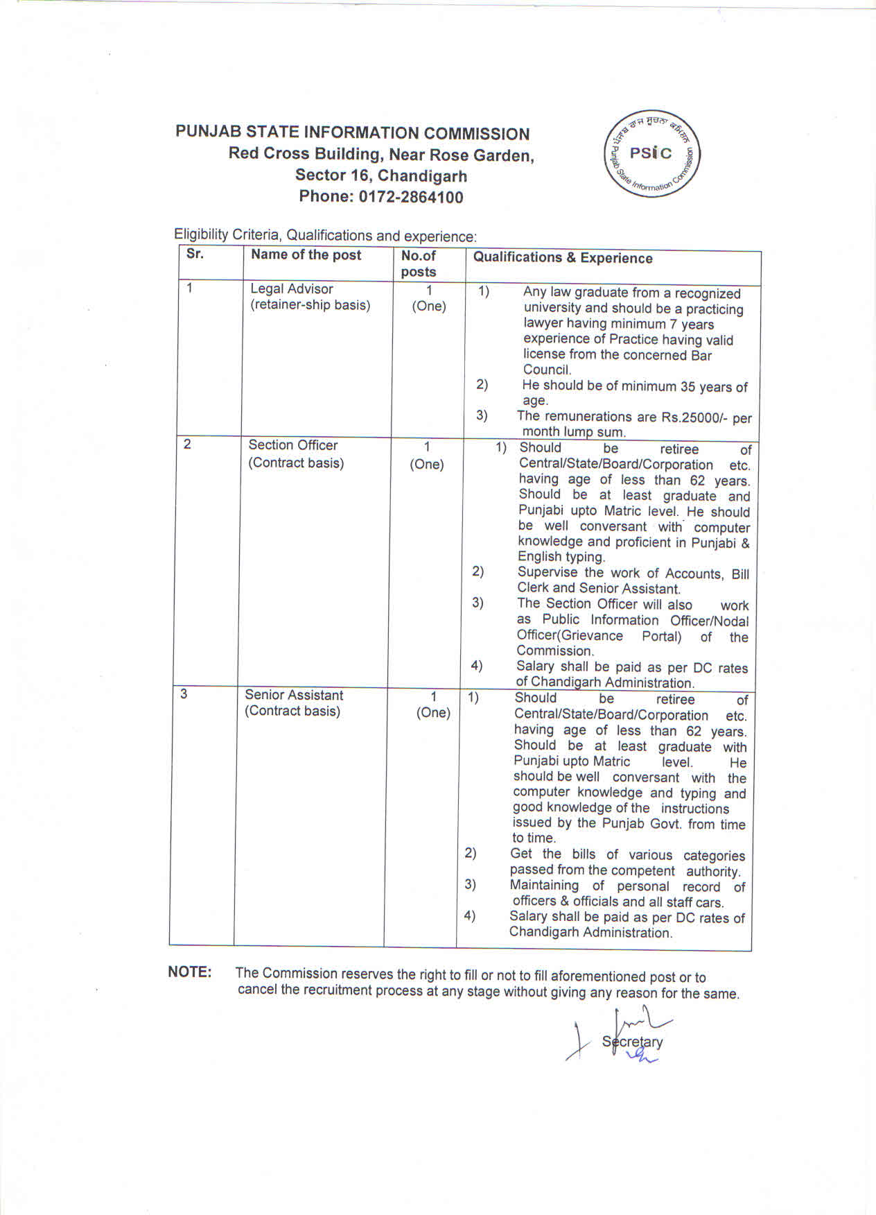Eligibility Criteria, Qualifications and experience for Walk in Interview dated 14-01-2026 at 03:00 PM for the post of one Legal Advisor (On retainership basis), one Section Officer (Contract basis) and one Senior Assistant (Contract basis) in the office of Punjab State Information Commission.